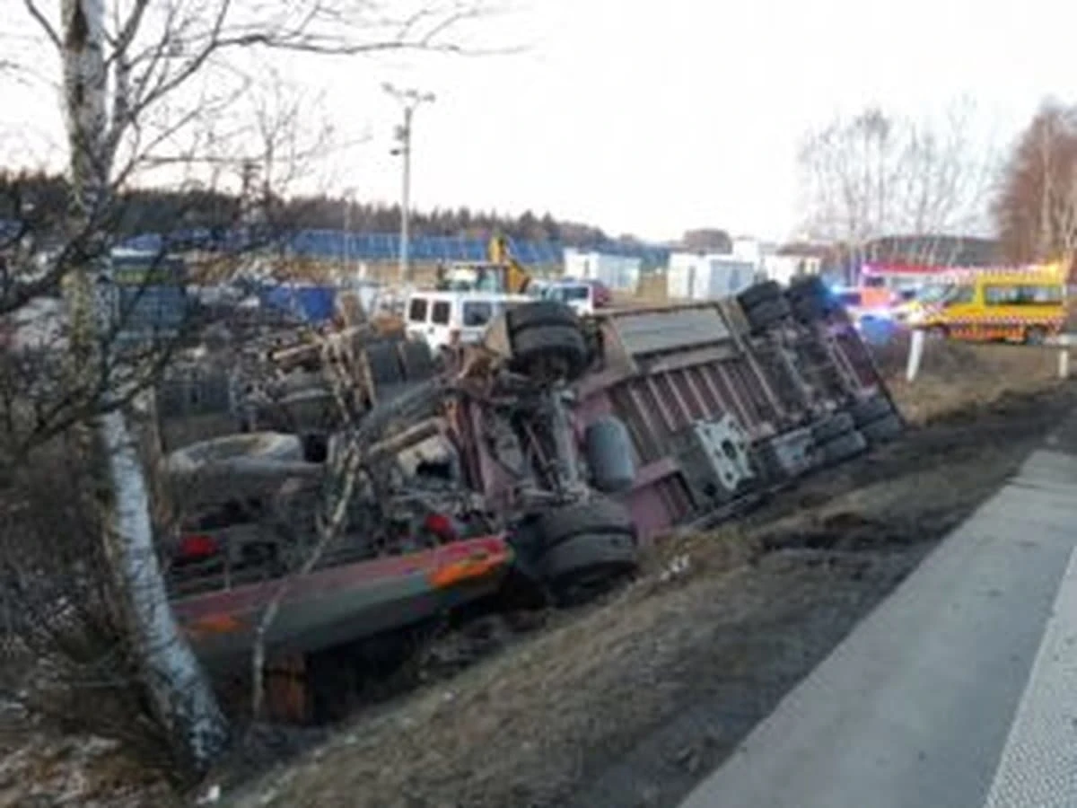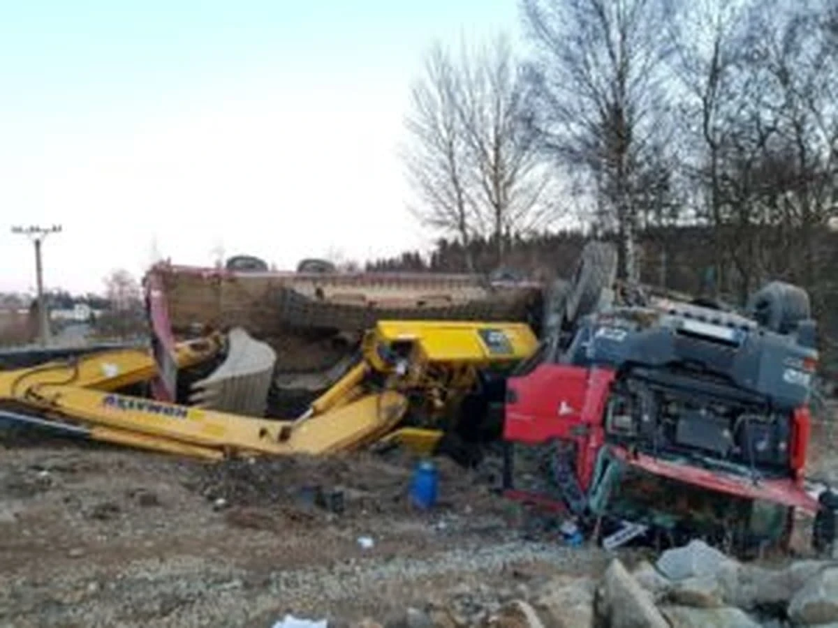 Around 6 pm, a truck carrying a 25-tonne excavator was demolished on road I / 34. The vehicle and the cargo ended up in a gutter, tipping over to the roof.