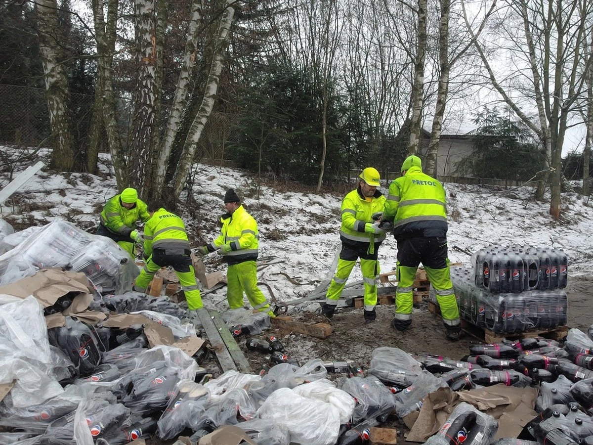PRETOL’s workers removed the spilled cola from the road. 'We arranged individual undamaged packaging onto pallets, which we then placed into a waiting replacement vehicle using handling equipment. Other bottles from damaged packaging had to be re-loaded individually,' said PRETOL employee Rostislav Burian.